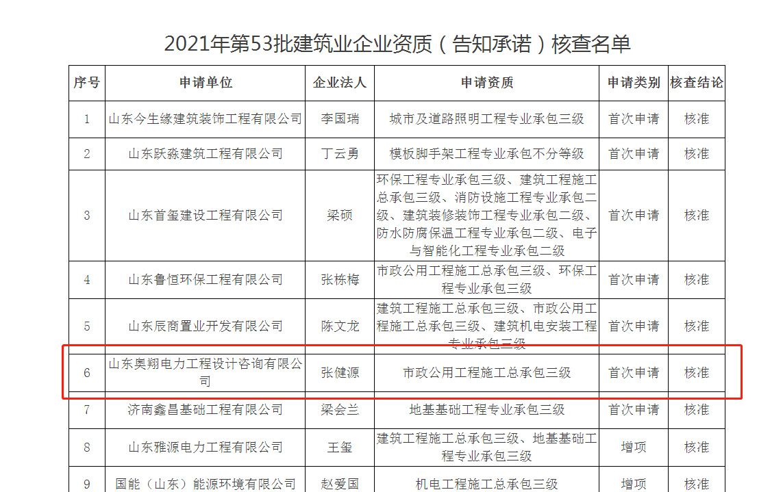 近日,濟(jì)南市行政審批服務(wù)局發(fā)布《關(guān)于2021年第53批建筑業(yè)企業(yè)資質(zhì)(告知承諾)核查名單的通告》,山東奧翔電力工程設(shè)計(jì)咨詢有限公司獲得由濟(jì)南市行政審批服務(wù)局頒發(fā)的電力工程施工總承包三級資質(zhì)。